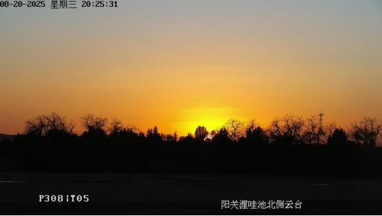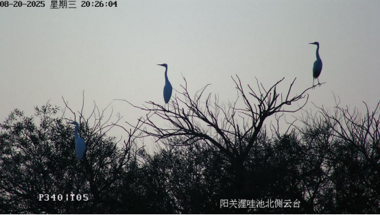 8月20日傍晚,甘肃敦煌阳关国家级自然保护区鸟类监测人员通过湿地野外监控系统,捕捉到一幅生动而富有诗意的画面:十余只大白鹭翩然飞至湖畔高树,仿佛相约“共赏”湿地落日霞光。