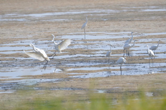 大白鹭属阳关湿地的过境候鸟。每年立秋左右陆续到达,十月下旬迁离。偶尔,也有十多只在西土沟流域越冬。目前,在湿地活动的鹭科鸟类除大白鹭外,还有小白鹭、苍鹭、夜鹭、池鹭、草鹭、牛背鹭等9种,监测数量达数百只。其中,大白鹭单日监测最多记录为362只。