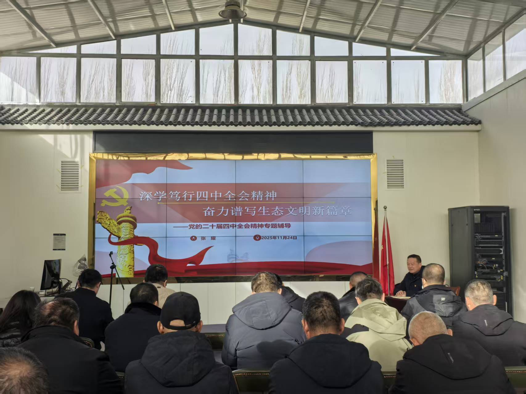 为推动党的二十届四中全会精神在生态保护一线落地生根,近日,敦煌阳关管护中心负责人深入基层保护站,专题宣讲解读党的二十届四中全会精神,将会议精神转化为护林员守护生态的思想动力与行动指南。